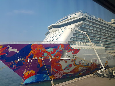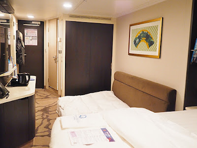 QB媽十多年前也有坐過一次郵輪, 當時已覺得十分華麉舒適. 而今次我們一家三口乘坐的世界夢號於去年11月才正式首航, 船上設施相當新淨, 配套也完善. 世界夢號排水量為 150,695 噸,長度達 335 米, 寬度為 40 米, 並擁有 18 層甲板, 客房多逹1686間, 載客量為3,376人, 絕對堪稱海上巨無霸. 登船手續簡便, 只要以個人證件於自助櫃位或普通櫃枱登記後, 便能取得電子房咭, 每位旅客也有一張. 然後便在大堂等侯上船. 大約7時左右便開始登船, 經過入境處出境手續和行李檢查後, 便能從登船通道登上郵輪了, 過程順利明快.