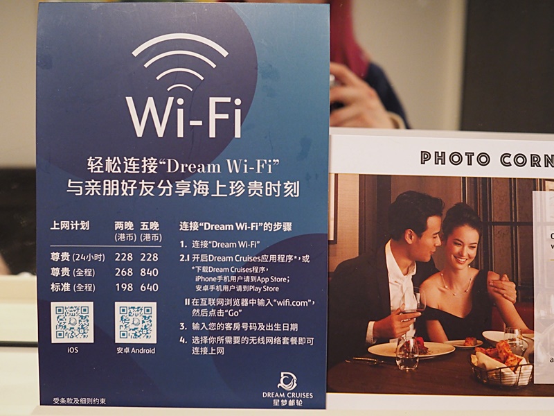 沒有手機不行的媽媽, 出發前曾擔心在這幾天會"斷六親" ... 結果給老公諷刺我這是什麼年代, 這麼先進的郵輪必有衛星導航系統, 自然可以連接Wifi上網! 船上有全天侯收費Wifi供應, 只要Download星夢郵輪的Dream Cruises App, 在航程中開啟飛行模式, 再接連Wifi, 就能如日常般隨時隨時隨地上網或在社交平台分享, 網絡比我預期中穩定和速度快呢! 只要按需要購買Wifi Plan便可, 而每個收費Plan能同時Share兩部手機使用, 價錢合理.