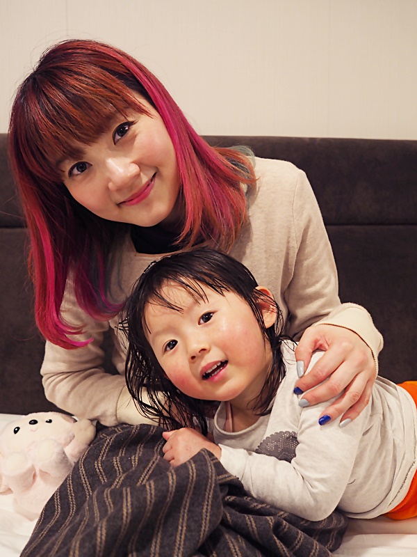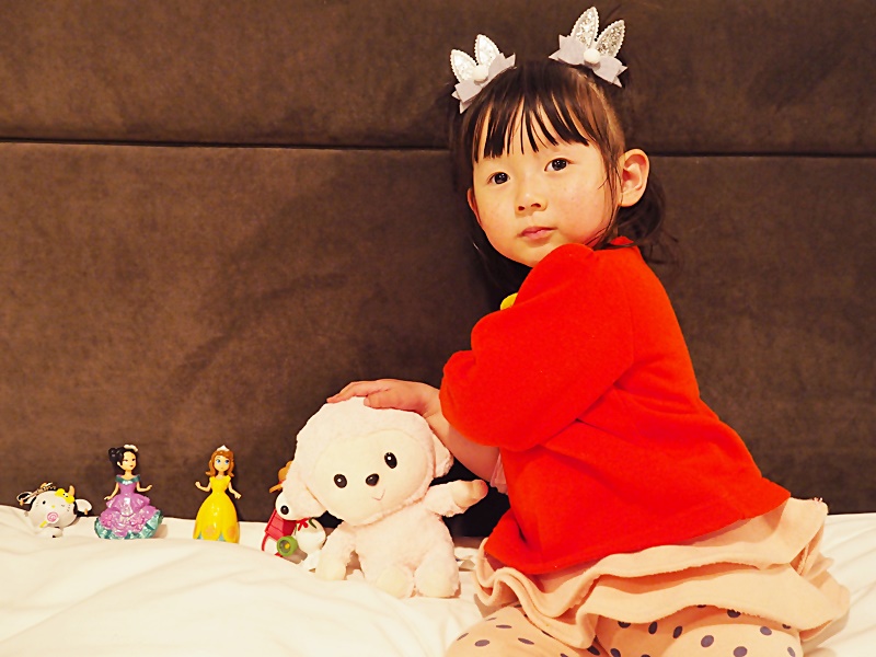QB一見有"自己"的床, 相當興奮和雀躍, 二話不說就跳上去, 還跟我們說不能睡她的床呢XD.. 房間內的基本設備如熱水煲, 樽裝水, 茶, 毛巾, 拖鞋, 風筒等也有提供