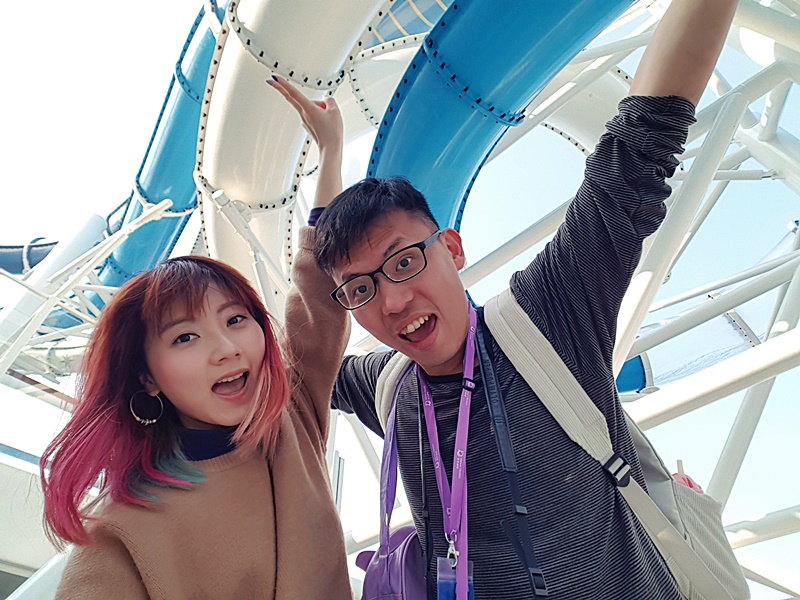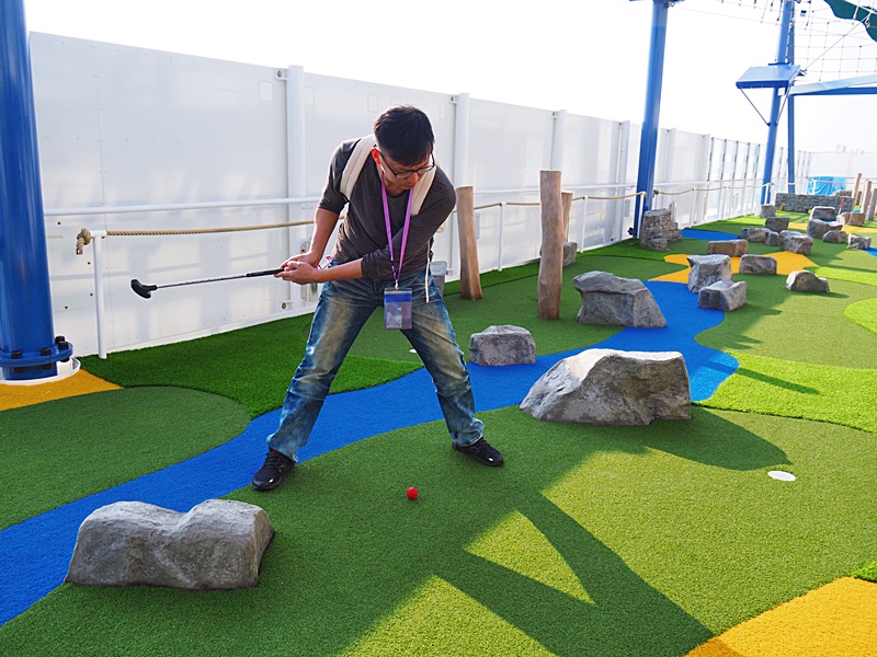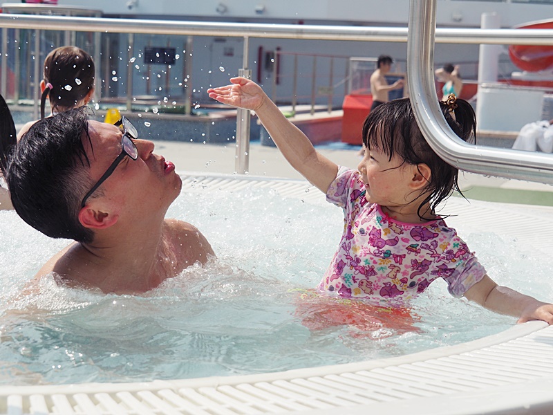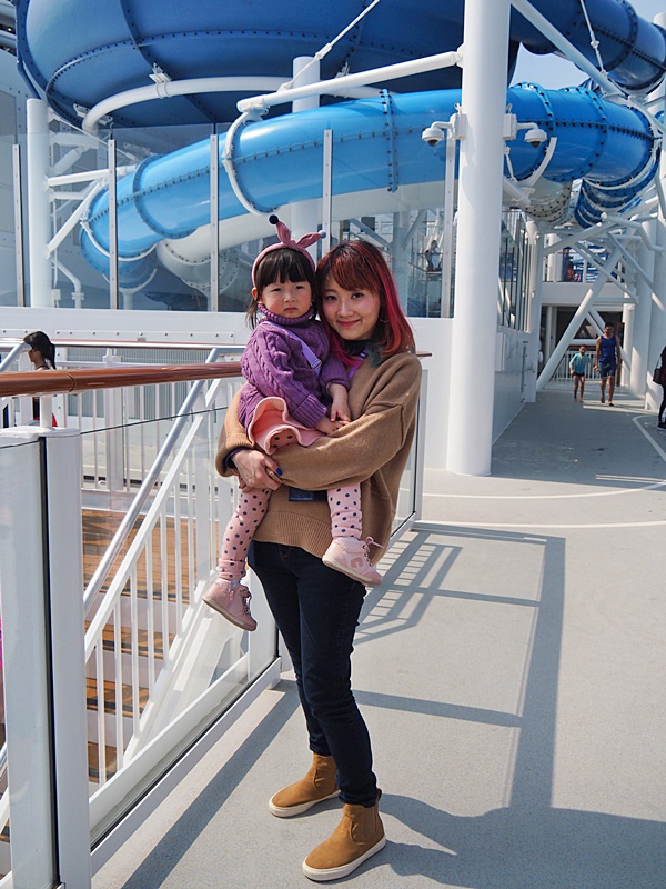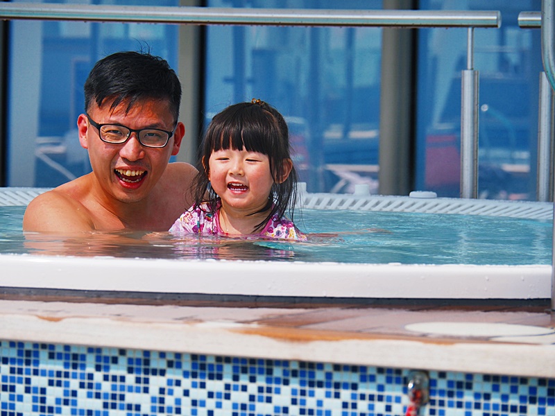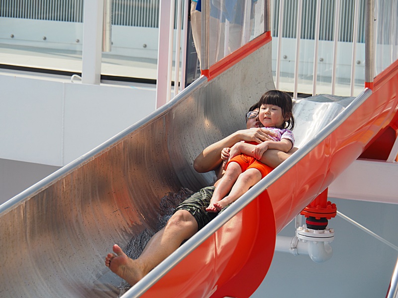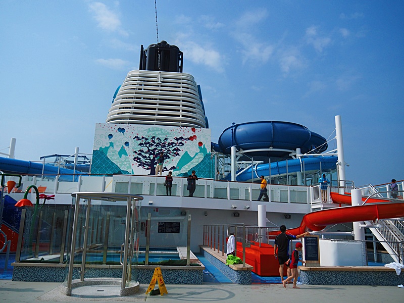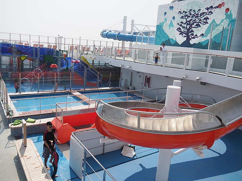 16樓甲板有大型水上樂園, 亦有多條滑水梯, 本來還以為天氣寒冷不能玩水, 但原來當郵輪駛出公海後, 氣温相當暖和, 加上天清氣朗, 2月份竟感到有點熱呢! 所以記緊一定要帶備泳衣, 拖鞋等, 才可以跟小朋友一齊玩水.