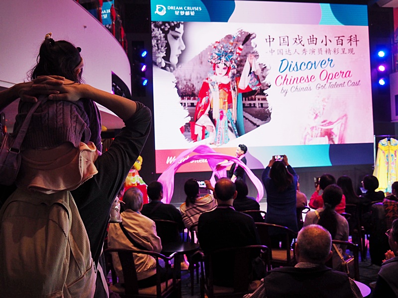 而6樓大堂亦有提供不少工作坊給旅客參與, 如海上糖畫工作坊, 邀請到著名「糖畫先生」高曉明先生以糖作筆,畫出各種不同形態的糖畫工藝品. 如要參加, 也要預早一天報名.我們還看了中國戲曲小百科, 有京戲演員即場表演如何化京戲妝, 吸引得一眾較年長的旅客看得目不轉睛. 其他表演項目還有樂高工作坊, 餐巾折叠, 拉丁舞表演等..