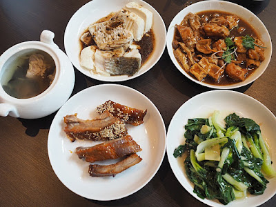 餐廳提供套餐, 像這天的午飯, 三人套餐有四餸一湯, 也相當豐富.