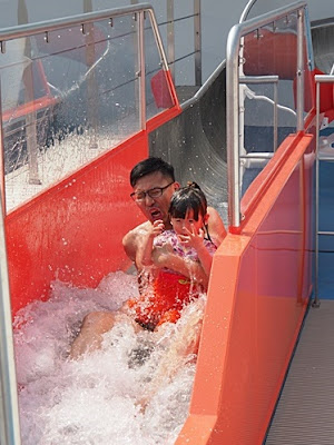 QB看見大型滑水梯, 已嚷着要玩, 媽媽忘了帶泳衣, 那就把陪玩任務交給爸爸啦...