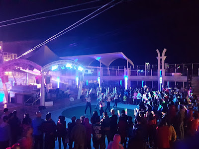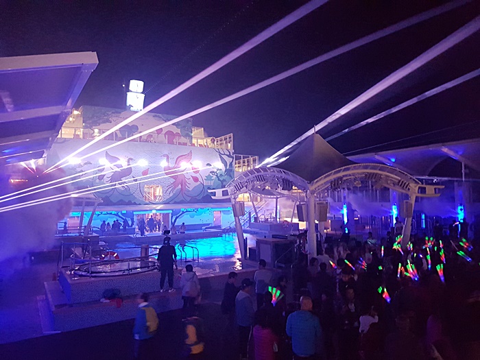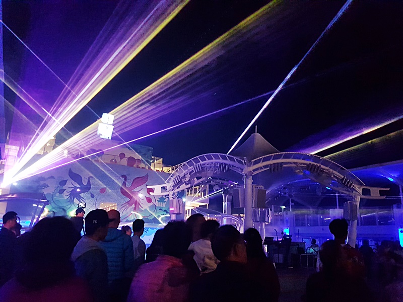 在16樓的甲板上, 早已擠滿來欣賞的旅客, 一道道熣燦的激光映照在漆黑的夜空中, 是近距離版的幻彩詠香江, 而且有表演者送上勁歌熱舞, 現場氣氛相當高漲, 各人都忍不住舞動起來, 熱血沸騰. 十分喜歡跳舞的QB也被場內氣氛帶動, 扭動小小身軀跳起舞來, 十分可愛.