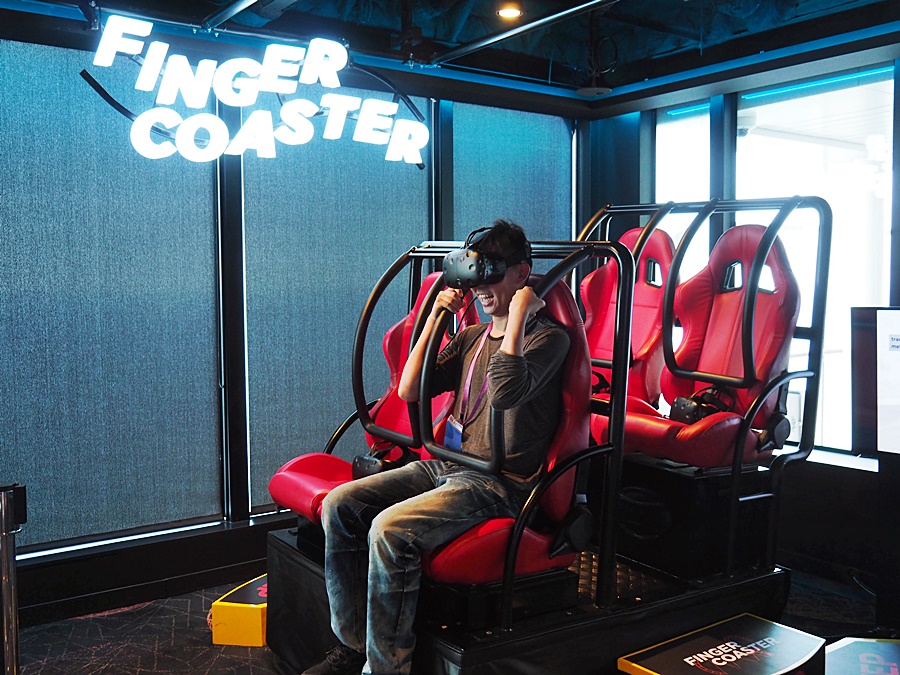 然後有工作人員幫忙帶上眼罩, VR極限過山車開動...爸爸玩得手舞足蹈, 看得旁邊的我也忍不住笑出來, 到底有幾刺激, 只有他能體會了...