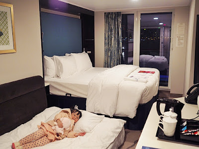 我們入住露台客房, 客間並不算十分大, 但也簡潔舒適, 因QB已兩歲多而且多數跟我們同睡, 因此我們並無事先要求嬰兒床, 但服務員預先把雙人床旁邊的梳化床鋪好.