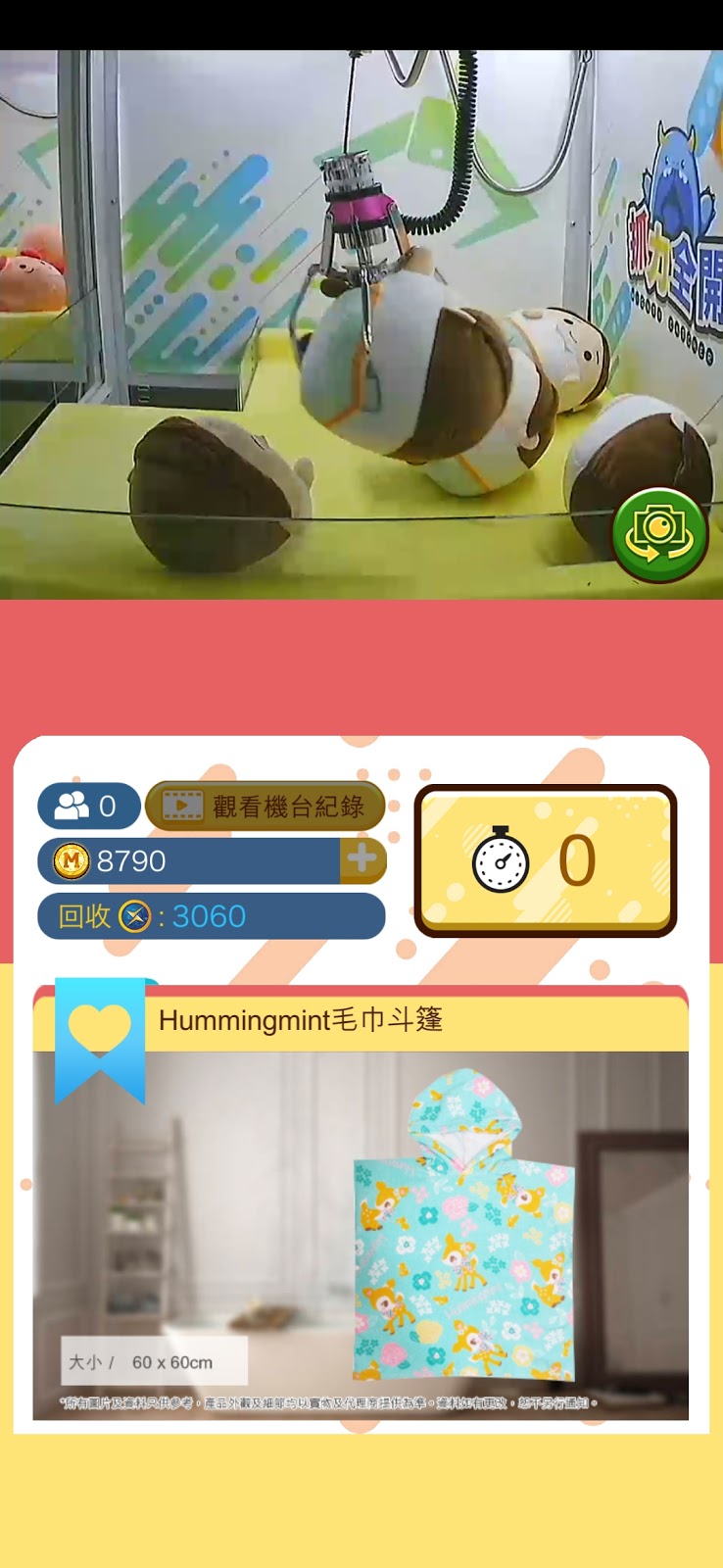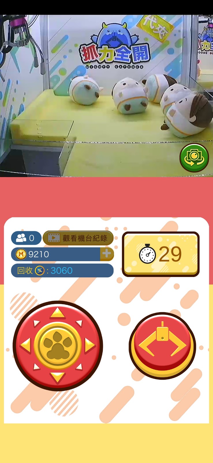 確定後會扣取所需的金幣, 並開始進入遊戲, 每局預設30秒。玩法跟平時實體店的夾公仔差不多, 用App內的方向鍵移動個夾。另外屏幕設有live streaming鏡頭, 播放實體公仔機的即時影像, 2個鏡頭分別正面和側面影住真的公仔機, 玩家可以多角度去判斷落夾既位置, 即時操控隻抓移動, 增加成功率。