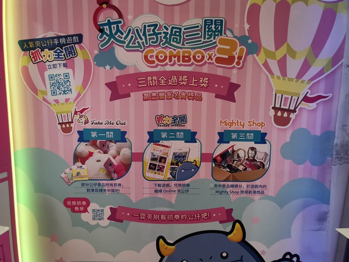 店內推出左「夾公仔過3關」活動, 只要於《抓力全開 x Take Me Out》主題店中成功夾到指定的公仔或精品,會附送《抓力全開》抓券卡, 可於手遊中換取積分繼續夾公仔。