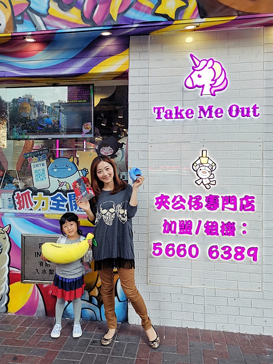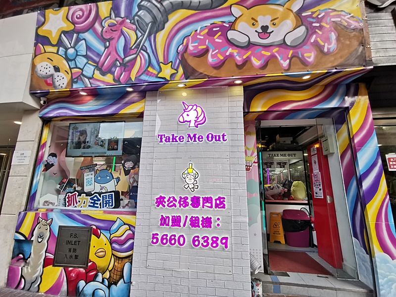這是位於紅磡區的《Take Me Out》夾公仔專門店, 雖然座落舊區, 但設計好Colorful, 一眼就會望到架啦。