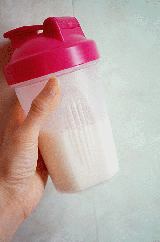 我這人懶起來可以很沒譜, 如果還要我左溝右溝一定吃不到兩次就放棄了. 這款代餐的賣點之一就是簡單, 只要注入200-250cc凍水在附送的膠杯內, 然後倒人一整包奶昔, 再搖勻2-30秒便可以飲用了.