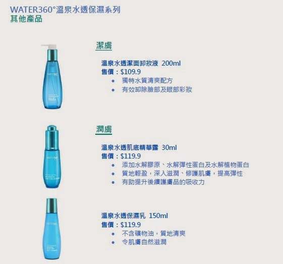 香港夏天的氣侯又濕又笠, 實在很怕用上厚重的護膚品, WATER 360° by Watsons 溫泉水透保濕系列, 既補水質地又清爽, 用後感覺特別清新.