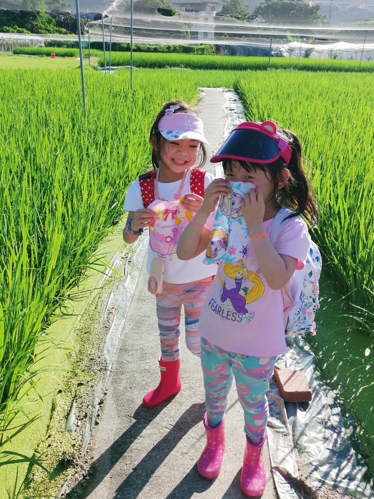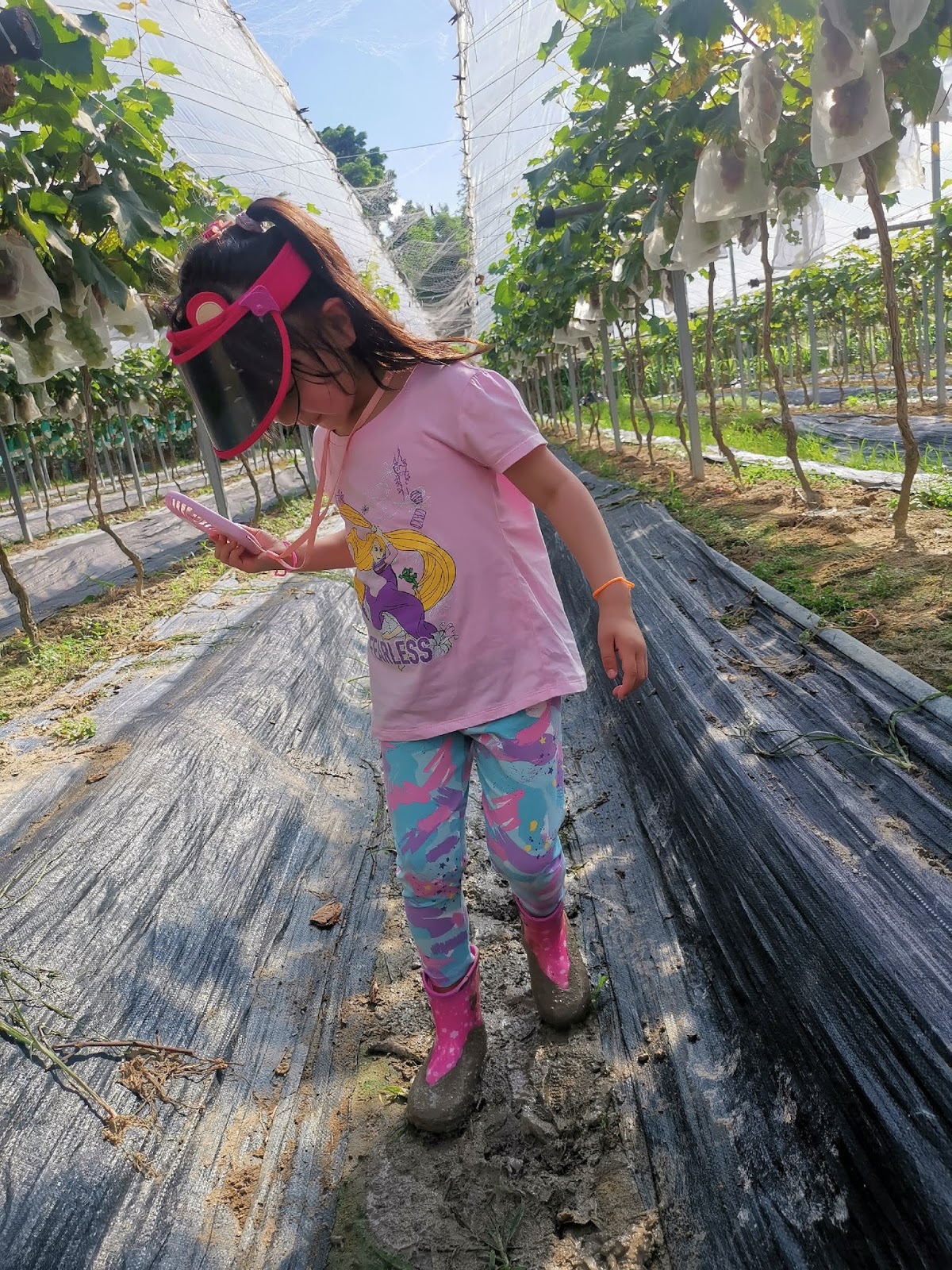 兩位小妹妹本來大叫熱,唔多願郁,對比提子,佢地更愛既係提子田內的泥氹,因為落過雨所以幫兩人換上水靴,任踩都唔怕,所以佢地好訓身咁玩泥,瞬間變左屎撈人咁,仲哈哈大笑。
